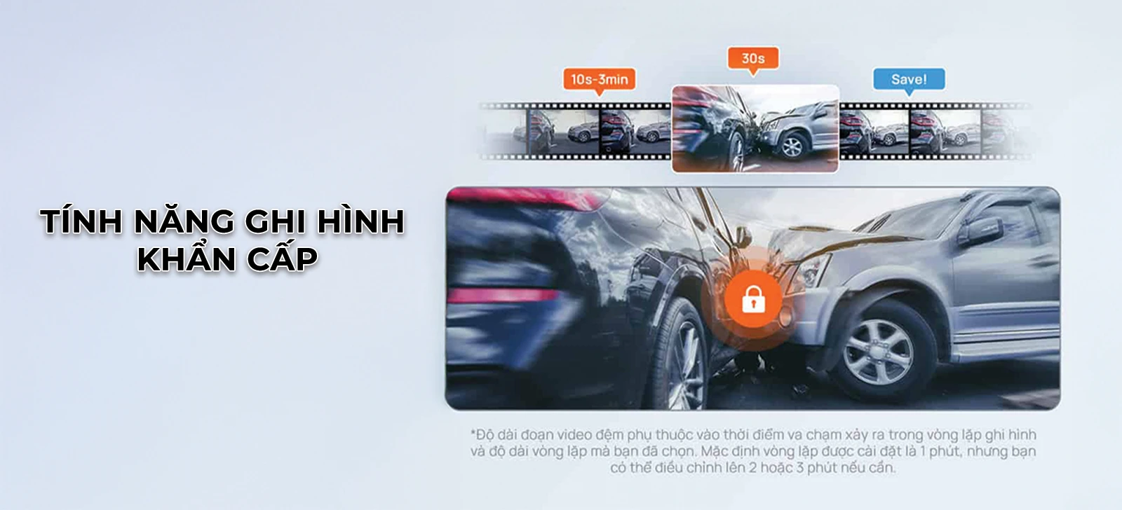 Camera tự động ghi hình liên tục theo vòng lặp và tự khóa video khẩn cấp khi phát hiện va chạm. Khi có sự kiện đột ngột, camera giữ lại video trước và sau sự kiện để bạn có bằng chứng đầy đủ khi cần.