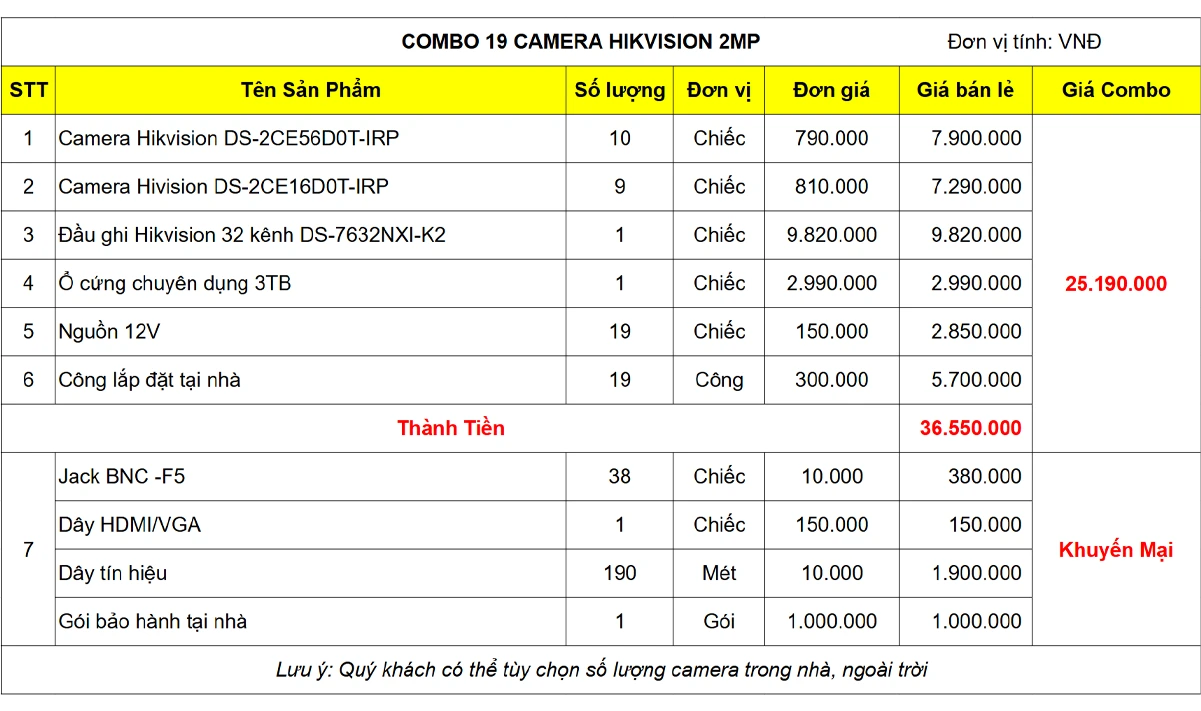 Khi mua trọn bộ 19 camera Hikvision 2MP tại Digione, quý khách hàng sẽ được sở hữu một bộ camera quan sát có dây chính hãng với giá cả hợp lý nhất. Tất cả các combo đều được hỗ trợ với chi phí tiết kiệm hơn so với mua riêng lẻ các sản phẩm, kèm theo đó là nhiều khuyến mại hấp dẫn. Chi tiết bạn có thể xem ở bảng dưới đây: