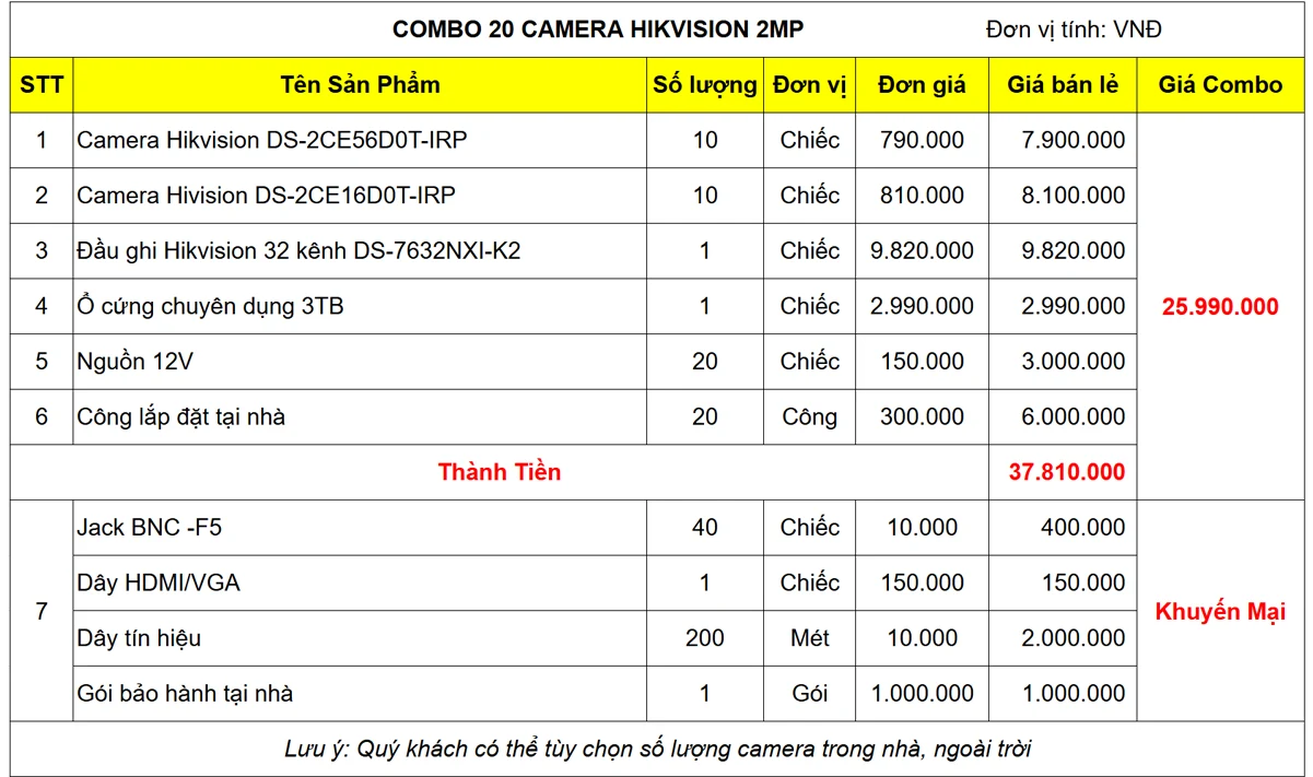 Khi mua trọn bộ 20 camera Hikvision 2MP tại Digione, quý khách hàng sẽ được sở hữu một bộ camera quan sát có dây chính hãng với giá cả hợp lý nhất. Tất cả các combo camera đều được hỗ trợ với chi phí tiết kiệm hơn so với mua riêng lẻ các sản phẩm, kèm theo đó là nhiều khuyến mại hấp dẫn. Chi tiết bạn có thể xem ở bảng dưới đây: