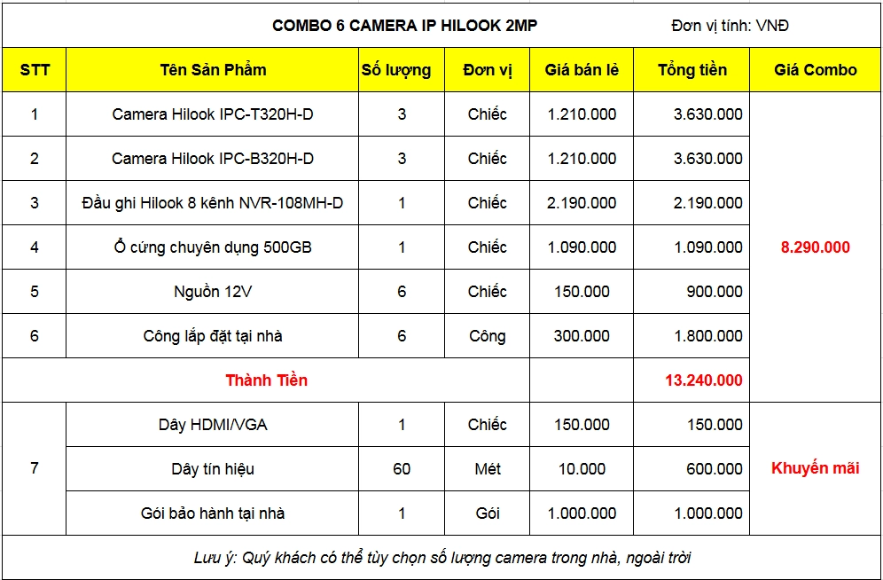 Tất cả các combo đều được hỗ trợ với chi phí tiết kiệm hơn so với mua riêng lẻ các sản phẩm, kèm theo đó là nhiều khuyến mại hấp dẫn. Chi tiết bạn có thể xem ở bảng giá lắp camera dưới đây: