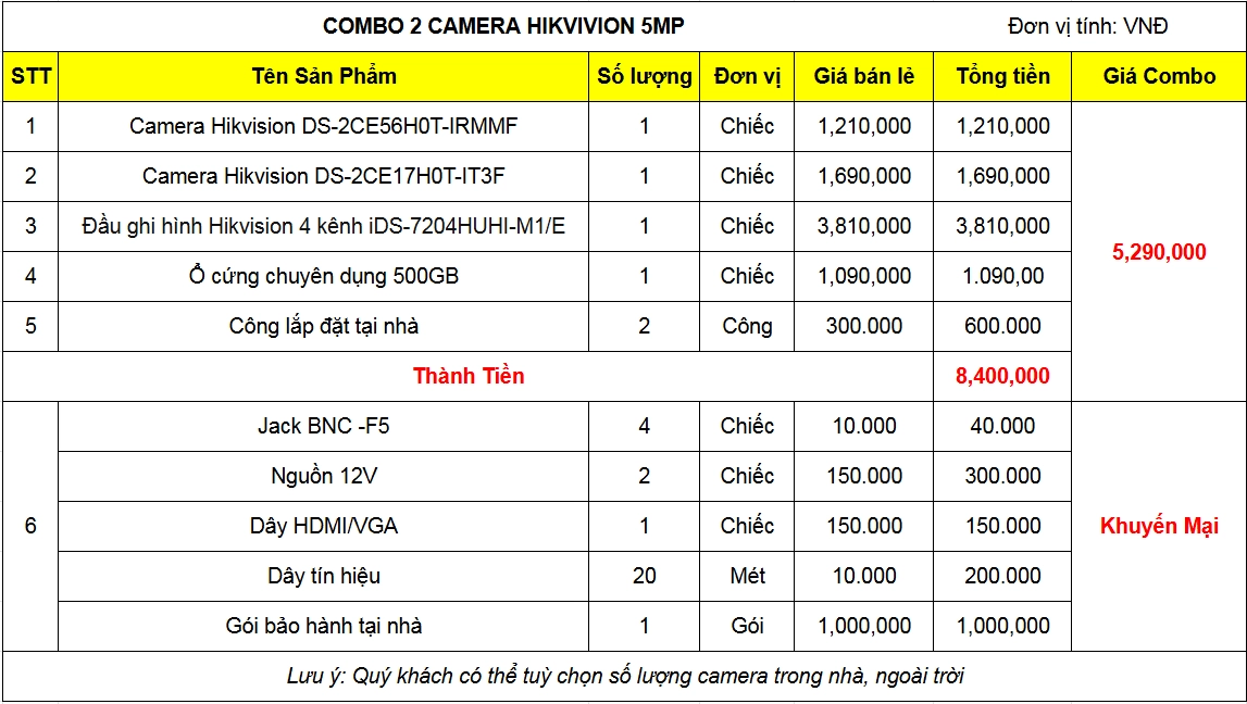Khi mua trọn bộ 2 camera Hikvision 5MP tại Digione, quý khách hàng sẽ được sở hữu một bộ camera quan sát có dây chính hãng với giá cả hợp lý nhất. Tất cả các combo camera đều được hỗ trợ với chi phí tiết kiệm hơn so với mua riêng lẻ các sản phẩm, kèm theo đó là nhiều khuyến mại hấp dẫn. Chi tiết bạn có thể xem ở bảng dưới đây:
