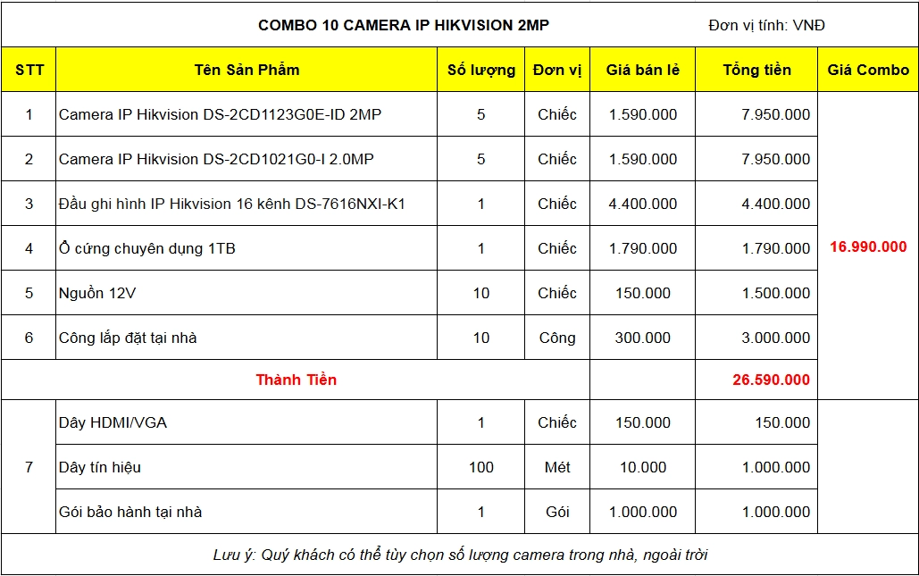Khi mua trọn bộ 8 camera IP Hikvision 2MP tại Digione, quý khách hàng sẽ được sở hữu một bộ camera quan sát có dây chính hãng với giá cả hợp lý nhất. Tất cả các combo camera đều được hỗ trợ với chi phí tiết kiệm hơn so với mua riêng lẻ các sản phẩm, kèm theo đó là nhiều khuyến mãi hấp dẫn. Chi tiết bạn có thể xem ở bảng dưới đây: