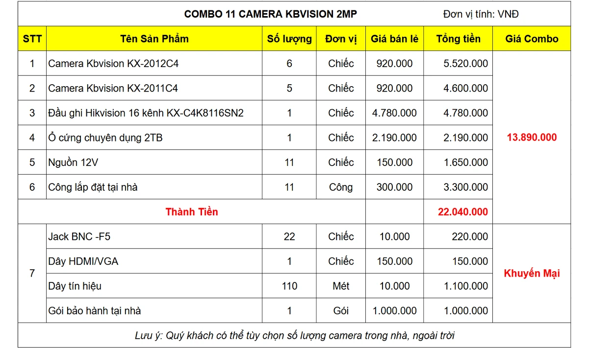 Trên đây là toàn bộ thông tin cơ bản và các chế độ ưu đãi cho Combo 11 camera giám sát 2.0M Kbvision mà bạn đang tham khảo.