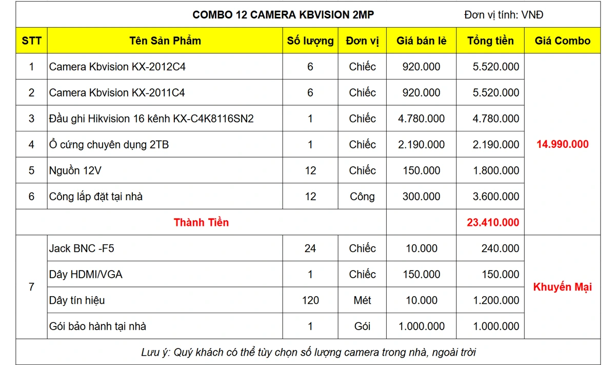 Trên đây là toàn bộ thông tin cơ bản và các chế độ ưu đãi cho Combo 12 camera giám sát 2.0M Kbvision mà bạn đang tham khảo.