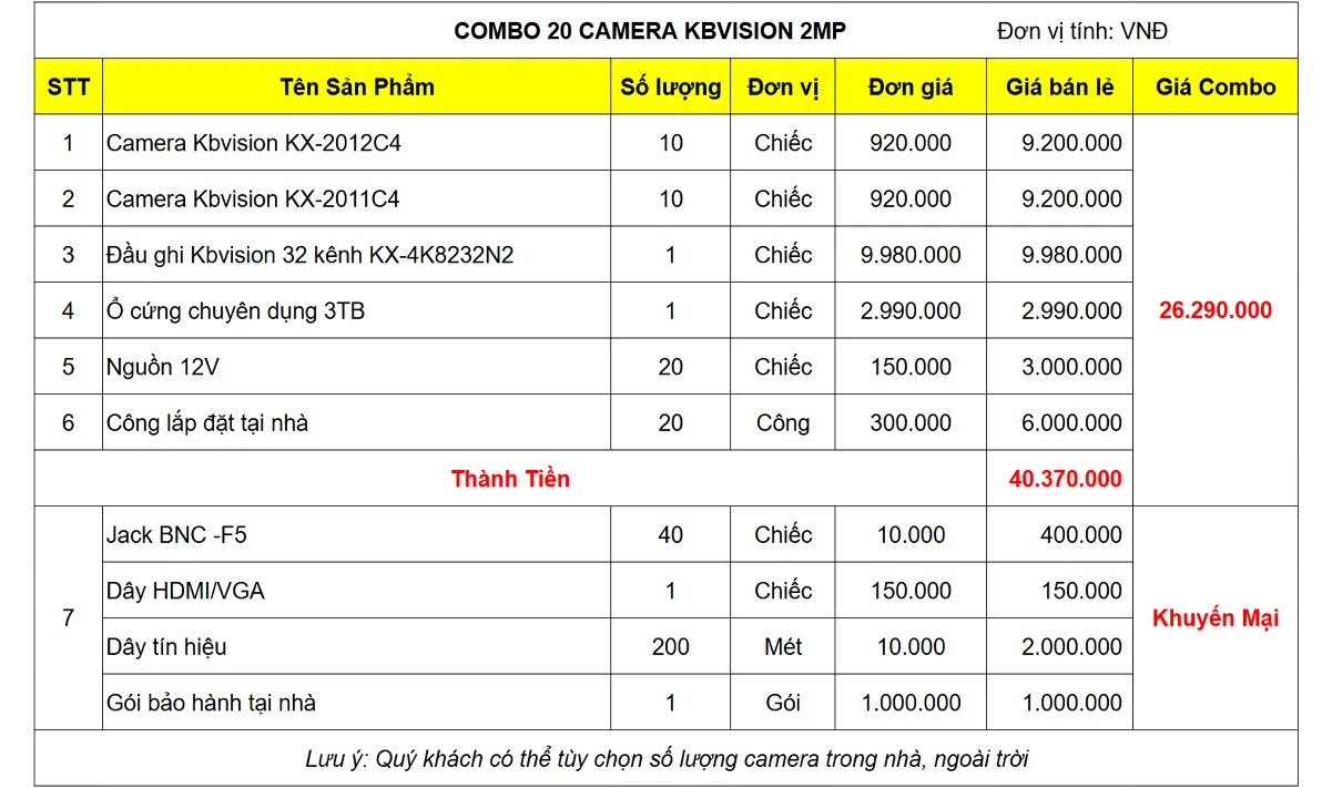 Khi mua trọn bộ camera Kbvision 2MP tại Digione, quý khách hàng sẽ được sở hữu một bộ camera quan sát có dây chính hãng với giá cả hợp lý nhất. Tất cả các combo đều được hỗ trợ với chi phí tiết kiệm hơn so với mua riêng lẻ các sản phẩm, kèm theo đó là nhiều khuyến mại hấp dẫn. Chi tiết bạn có thể xem ở bảng giá lắp camera dưới đây: