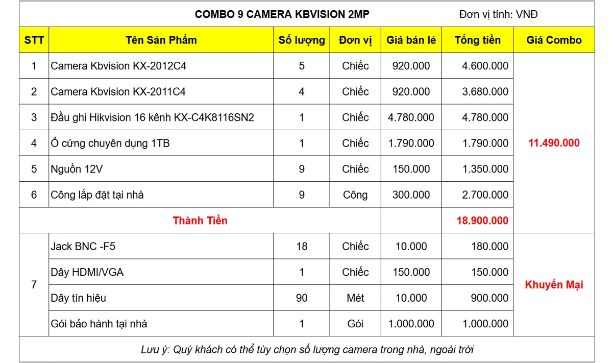Trên đây là toàn bộ thông tin cơ bản và các chế độ ưu đãi cho Combo 9 camera giám sát 2.0M Kbvision mà bạn đang tham khảo.