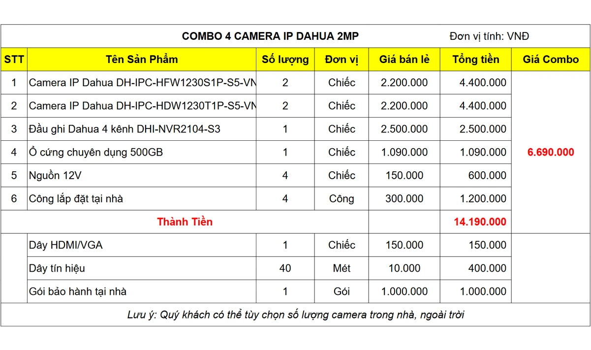 Khi mua trọn bộ camera 4 mắt IP Dahua 2MP tại Digione, quý khách hàng sẽ được sở hữu một bộ camera quan sát có dây chính hãng với giá cả hợp lý nhất. Tất cả các combo đều được hỗ trợ với chi phí tiết kiệm hơn so với mua riêng lẻ các sản phẩm, kèm theo đó là nhiều khuyến mại hấp dẫn. Chi tiết bạn có thể xem ở bảng dưới đây: