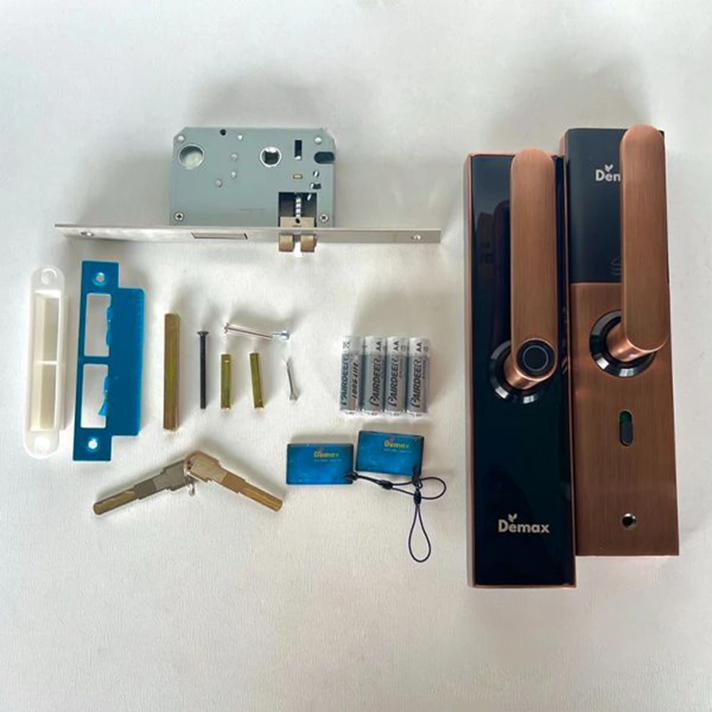 Demax EL266 AC lưu trữ 100 vân tay, 100 thẻ từ, 250 nhóm mật mã, kèm 2 thẻ và 2 chìa chống sao chép. Tay nắm có thể đổi chiều trái/phải, hỗ trợ chức năng riêng tư, thông phòng và thoát hiểm từ bên trong, mang lại sự an toàn và tiện lợi tối đa.