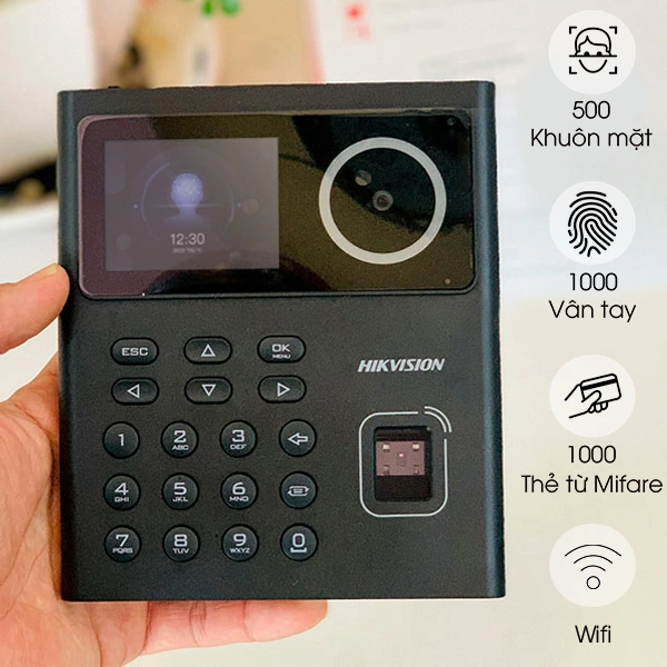 Hikvision ds k1t9320mfwx hỗ trợ chấm công, kiểm soát cửa bằng khuôn mặt, vân tay, thẻ tiện lợi có hỗ trợ kết nối wifi xuất dữ liệu nhanh chóng và đơn giản.