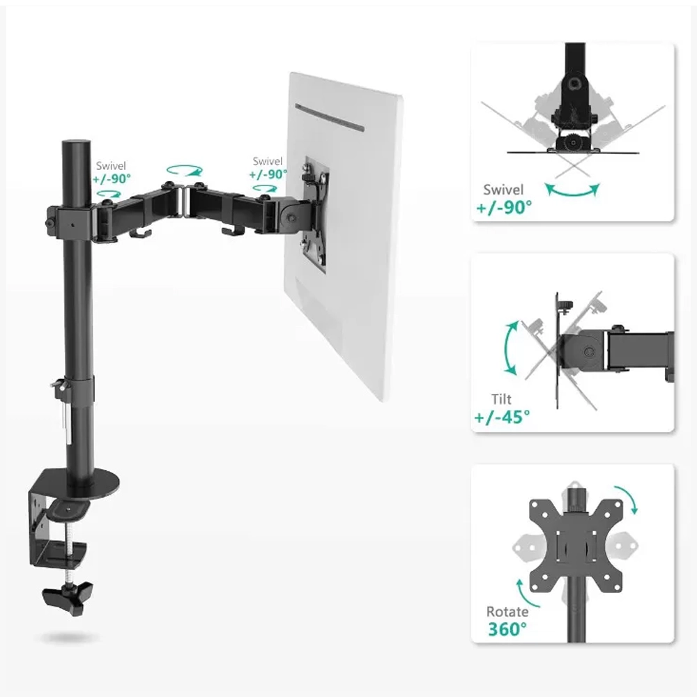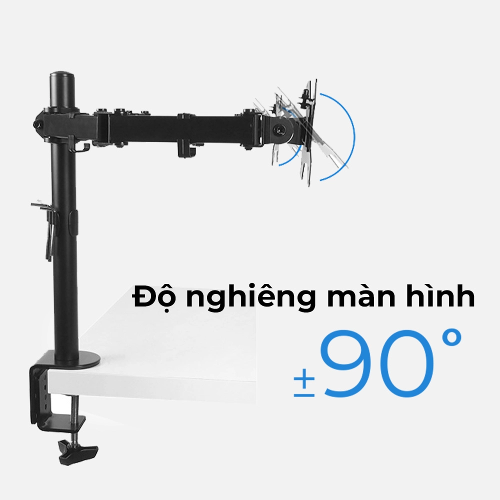 Khả năng điều chỉnh độ cao, thấp của giá treo này giúp điều chỉnh màn hình phù hợp nhất với người sử dụng.Khớp nối linh hoạt xoay 180° giúp điều chỉnh thoải mái theo tư thế làm việc. Tay treo màn hình có khả năng xoay 360°, điều chỉnh dọc - ngang một cách dễ dàng.