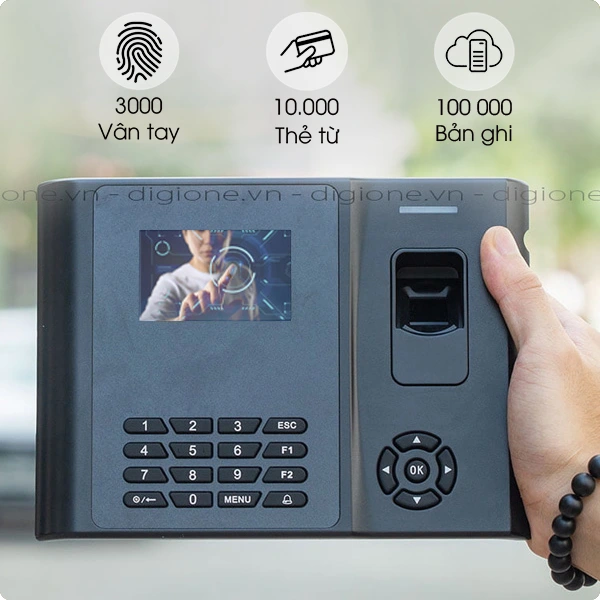 Máy được trang bị cả hai chức năng chấm công vân tay và thẻ cảm ứng với công suốt lớn. Với bộ nhớ quản lý lên đến 3.000 dấu vân tay, 10.000 thẻ cảm ứng và password, một người có thể đăng ký 10 vân tay.