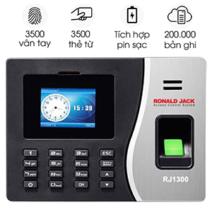 Máy chấm công Ronald Jack RJ1300 có dung lượng quản lý 3.500 dấu vân tay, 3.500 mật khẩu, bộ nhớ lưu trữ 200.000 lần giao dịch, chấm công bằng vân tay.