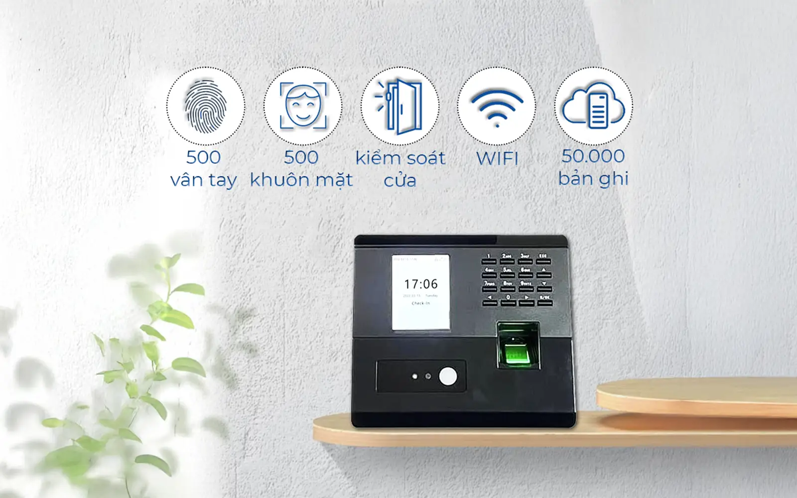 • Lưu trữ 500 khuôn mặt, 500 vân tay, 500 thẻ.