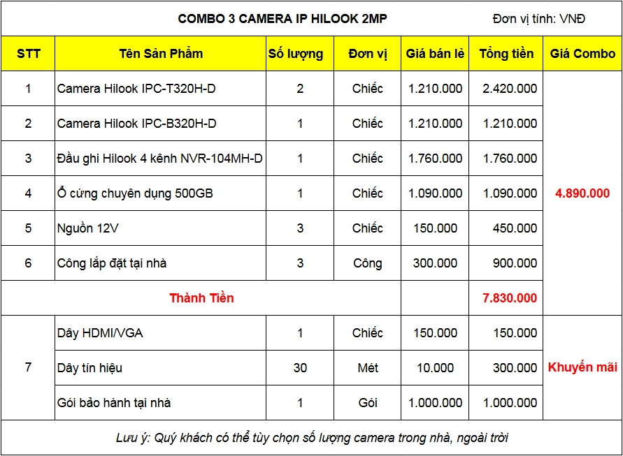 Tất cả các combo đều được hỗ trợ với chi phí tiết kiệm hơn so với mua riêng lẻ các sản phẩm, kèm theo đó là nhiều khuyến mại hấp dẫn. Chi tiết bạn có thể xem ở bảng giá lắp camera dưới đây: