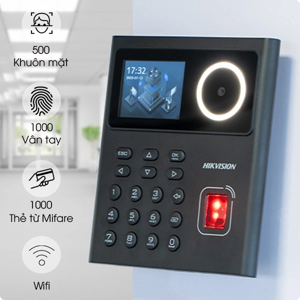 Hikvision ds k1t320mfwx hỗ trợ chấm công, kiểm soát cửa bằng khuôn mặt, vân tay, thẻ tiện lợi có hỗ trợ kết nối wifi xuất dữ liệu nhanh chóng và đơn giản.