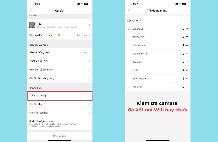 Vào mục Thiết lập mạng và kiểm tra Wifi đang kết nối với camera